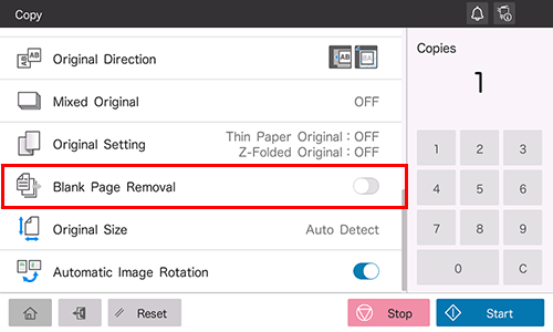 When [Blank Page Removal] is specified to scan an original including blank pages using the ADF, blank pages are excluded from scan targets. Blank pages detected are not counted as original pages.