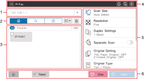 If you tap [IP Fax (SIP)] on the home screen, the main screen of IP fax (SIP) is displayed.
