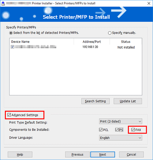 Select the [Advanced Settings] check box, and check that [FAX] is selected in [Components to Be Installed].