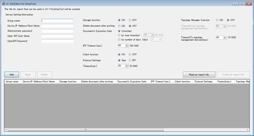 Use LK-114_Editor for SetupTool to configure information such as the IP address of the MFP to be assigned to a topology machine in a serverless pull printing group and create a serverless pull printing group configuration file.