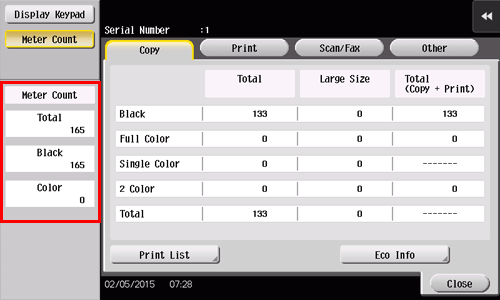 [2 Color] | [Total]: Indicates the total number of pages printed in 2 Color mode. [Large Size]: Indicates the total number of pages printed on large-size paper in 2 Color mode. [Total (Copy + Print)]: Indicates the total number of pages copied in 2 Color mode and that of pages printed in 2 Color mode through a computer. |
