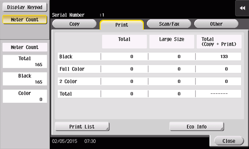[Color] | Allows you to check the total number of pages printed in Single Color, 2 Color, or Full Color modes. |
