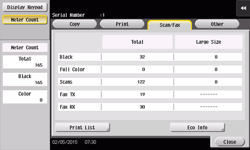 Check the total number of original pages scanned in the Scan/Fax or User Box mode as well as the total number of pages on which a file in a User Box or a received file is printed. Also check the total number of pages sent and received in the fax mode.