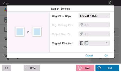 In [Original > Copy], select [1-Sided > 2-Sided], and select a desired bind position for copying in [Output Bind Dir.].