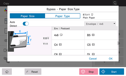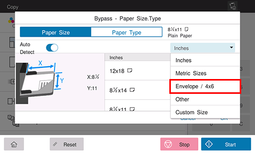 Load envelopes or postcards into the Bypass Tray, then specify the paper type and paper size of the Bypass Tray.