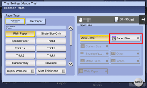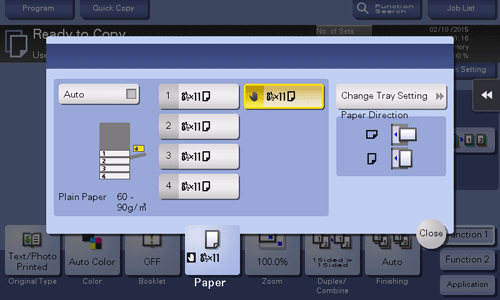 Tap [Paper], select Tray 1, Tray 2, or Bypass Tray, and tap [Change Tray Setting].