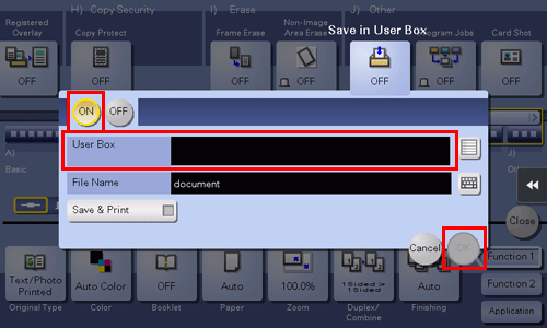 Tap [ON], select a User Box to use for saving in [User Box], then tap [OK].