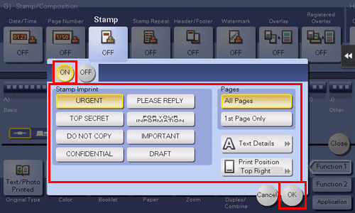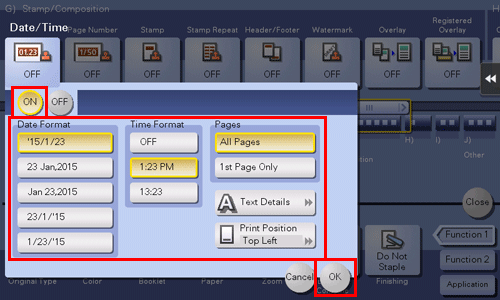 [Date/Time] | Select a format for the date and time to be printed. The date/time as of scanning the original is stamped. | |