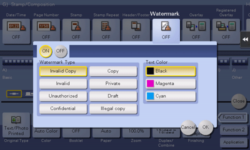 Part of the watermark may be lost depending on the paper size, such as A6 and B6. In this case, the machine automatically cancels the watermark function for copying.