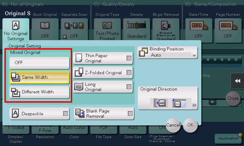 Even for an original with pages of different sizes, by using the ADF, you can scan data while detecting the size of each page. If the widths of the originals are the same, select [Same Width]. If the widths of the originals are different, select [Different Width].