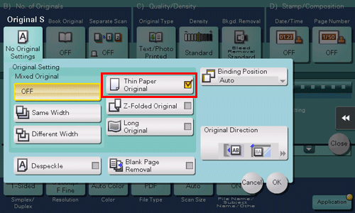 When [Thin Paper Original] is specified to scan an original of thinner paper than plain paper using the ADF, the system reduces the original feed speed to prevent thin paper from causing a paper jam.