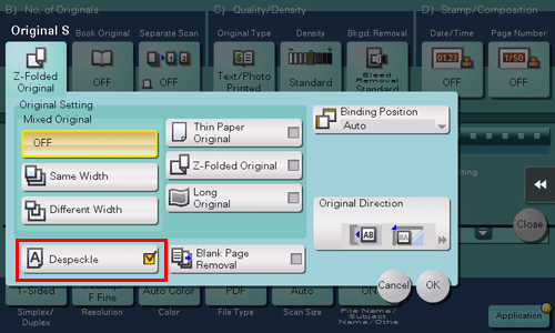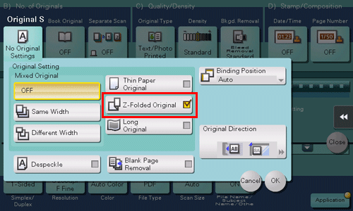 If a folded original is loaded into the ADF, the original size may not be able be detected accurately. When [Z-Folded Original] is specified, the original size can be accurately detected even for the folded original sheets.