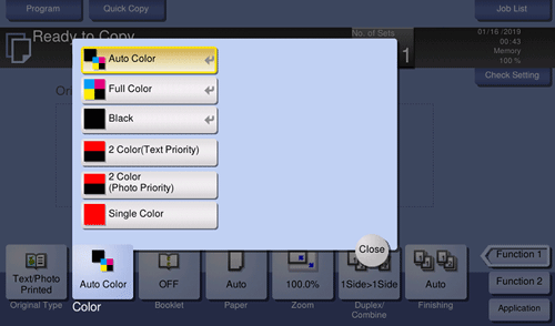 [Auto Color] | Makes copies with color settings to suit the colors of the scanned original. |