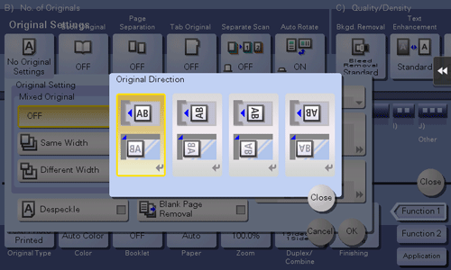 Even for an original with pages of different sizes, by using the ADF, you can scan data while detecting the size of each page. If the widths of the originals are the same, select [Same Width]. If the widths of the originals are different, select [Different Width].