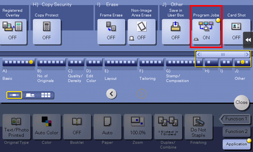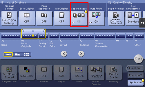 Scans each loaded original with different settings, and makes copies collectively. Use this function when various types of originals are mixed, such as 1-sided original to be printed on one side of paper, and 2-sided original to be copied by enlarging.