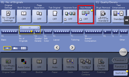 In general use, this machine automatically rotates the original image according to the paper direction to make a copy. Turning [Auto Rotate] OFF as needed enables you to make a copy without rotating the original image. This function is available when you want to copy only a part of the original.