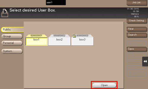 2. Select the desired User Box, and tap [Open].