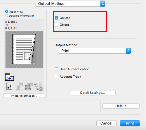 When the [Collate] check box in [Output Method] is selected, copies are output in a set-by-set manner, for example, "Pages 1, 2, 3, 4, and 5", "Pages 1, 2, 3, 4, and 5", and then "Pages 1, 2, 3, 4, and 5". When the [Offset] check box is selected, the output position is staggered one by one.