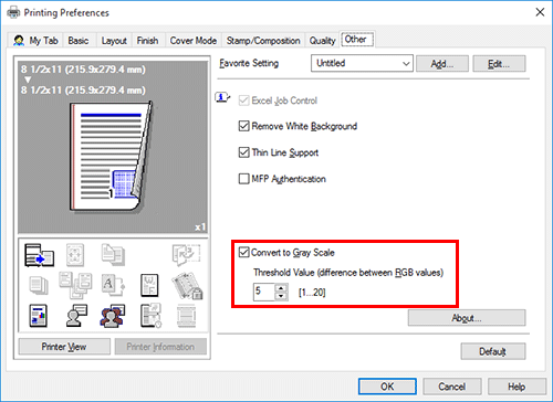 In the [Other] tab, check the [Convert to Gray Scale] box and set the threshold (the differential RGB values to be converted into gray scale).