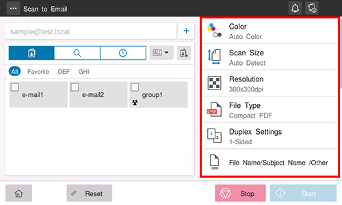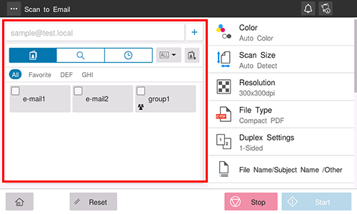 • Using the Stop key enables you to stop scanning the original. A list of the currently stopped jobs is displayed. To stop transmission, select the target job from the list, and delete it.