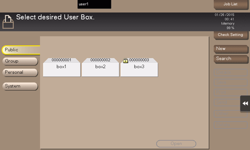 The User Box is created by the user. The created User Box is identified by a 9-digit User Box number. If user authentication or account track is installed, you can create a Personal User Box available for each user and a Group User Box available for each department.