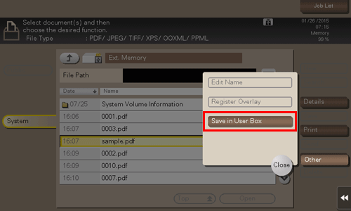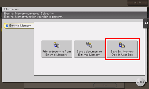 3. Tap [Save Ext. Memory Doc. in User Box].