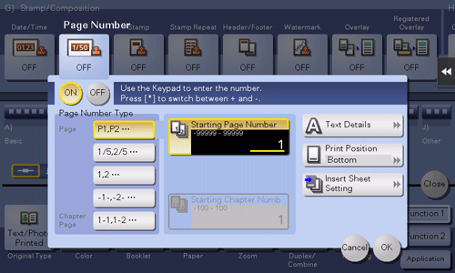 [Starting Chapter Number] | Specify the starting chapter number if a file is divided into chapters, and you want to print chapter numbers from the second chapter. You can specify starting chapter numbers when you have selected [Chapter Page] in [Page Number Type]. For example, to print chapter numbers from the third chapter, enter "-1". The first chapter of the file is counted as "-1", the second chapter as "0", and the third chapter is counted as "1". In [Starting Chapter Number], a chapter number is printed on the chapters that are count as 1 and later. If "2" is entered, a number is printed from the first page of the first chapter of the file as "2-1, 2-2". "-" (minus sign) switches "+" and "-" each time you tap [*]. |