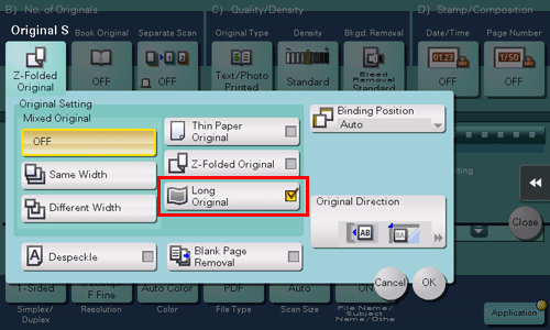 Load a long original that cannot be placed on the Original Glass and that is larger in the feeding direction than the full standard size (11 17 or A3) into the ADF. When [Long Original] is selected, the ADF automatically detects the size even if you do not pre-specify the original size.