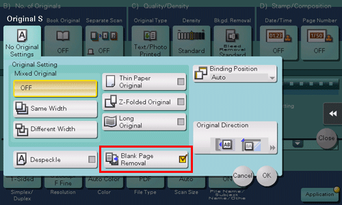 The [Blank Page Removal] function cannot be used with the functions by which the size of paper cannot be specified (the [Long Original], [Z-Folded Original], [Mixed Original] functions) simultaneously.
