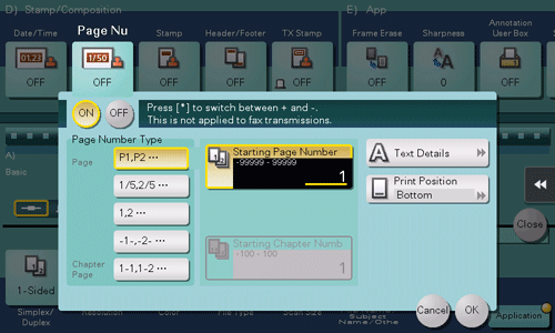 [Starting Chapter Number] | Specify the starting chapter number if a file is divided into chapters, and you want to print chapter numbers from the second chapter. You can specify starting chapter numbers when you have selected [Chapter Page] in [Page Number Type]. For example, to print chapter numbers from the third chapter, enter "-1". The first chapter of the file is counted as "-1", the second chapter as "0", and the third chapter is counted as "1". In [Starting Chapter Number], a chapter number is printed on the chapters that are count as 1 and later. If "2" is entered, a number is printed from the first page of the first chapter of the file as "2-1, 2-2". "-" (minus sign) switches "+" and "-" each time you tap [*]. |