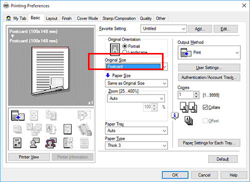 In [Original Size] on the [Basic] tab, select [Envelope] or [Postcard].
