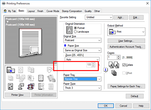 In [Paper Size] in the [Basic] tab, select the size of paper for printing. The zoom ratio is automatically determined by the paper sizes selected in [Original Size] and [Paper Size].