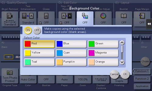 Colors the blank area of the original with a specified background color to make copies.