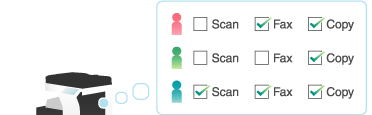 Installing user authentication or account track enables you to restrict available functions by user or account. For example, you can configure settings so that printing is available for a specific user or account track but not available for other users or account tracks. Also, you can configure settings to restrict printing for users who are not identified by this machine (pubic users). Configuring settings based on business requirements of users or account tracks helps to reduce costs.